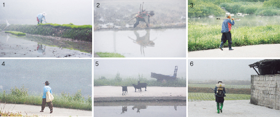 | 1 몰무동 논에 물꼬 트고 모판을 끄집어내고 있는 주영이 어머니. 2 우꿀 소막에 깔 비러 가는 길에 물꼬를 막고 있는 재수네 아버지. 3 세몰마을 앞 봇도랑논으로 모 때우러 가는 점순이 아버지. 4 마을에서 제일 먼저 논에 나가 모내기 할 논에 물꼬 틀고 나서 다시 밭에 가는 재수네 어머니. 5 모내기하려는 논을 들여다보고 있는 재수네 염소들. 6 약 치러 가는 종길이 아제. 지난 5월26일 토요일 내 고향 진뫼마을 어르신들의 새벽. “새복에 한나절 일은 히야 일 추리 나가제”하시며 총종 종종걸음…. |