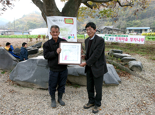 '풀꽃세상' 허정균(우) 회장이 박한수 전 이장님께 풀꽃상을 전달하고 기념사진을 찍었다. 탯줄 묻은 고향에서 스물 일곱 해 사는 동안 내게 항상 그늘이 되어주어 나를 키워준 정자나무. 고향을 떠나 객지생활 하면서 외로울 때마다 나는 얼마나 정자나무를 그리워하며 살았던가. 부모님 다음으로 내게는 큰 그늘이 되어주었고 고향에 갈 때마다 강 언덕에 서서 맨 먼저 나를 반겨주던 정자나무였다. 수염이 하얗게 휘날리던 할아버지, 굽은 어깨 펴던 아버지, 코흘리개 친구들 모두 모여 왁자지껄 떠들고 놀던 정자나무. 이젠 다 떠나고 지금 마을에 남아있는 아버지 겨우 일곱 분만이 살고 있을 뿐이다. 70년대 중반까지만 해도 사십 가구를 넘보던 흥했던 마을은 이제 쪼그라들 대로 쪼그라들어 열 다섯 가구에 총 서른 명이 살고 있어 절속 같은 마을로 변해있다. 풀꽃상 받는다는 소식 전해들은 정자나무는 시상식 날 찾아올 손님들에게 아름다운 자태 뽐내기 위해 떨어지려는 낙엽 어찌나 힘겹게 붙들고 있더니 그만 홍조 띤 얼굴 검붉어져 있는 듯 하다. 어여쁘게 몸단장하고 상 받으려 안간힘 쓰고 있는 모습을 보니 사람이나 나무나 상 타는 게 좋긴 좋은 모양이다.