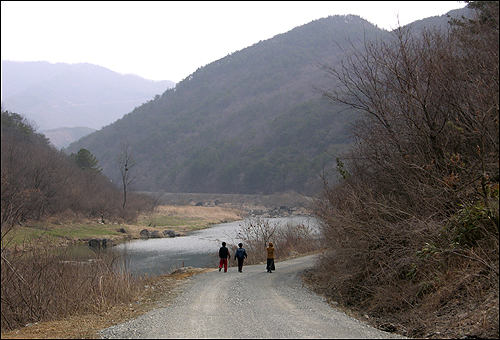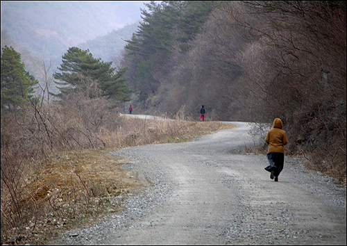 운동 나서는 아버지들은 한 분도 없다. 모두 어머니들뿐이다. 현재 열 다섯 가구인 진뫼마을에 아버지들은 모두 여덟 분이 살고 있다. 그 중 여섯 분이 겨울철이면 어머니들과 함께 회관 방에서 노는데 운동 나가는 것은 좀 쑥스러운지 한 분도 없다. 아니, 가끔씩 산으로 약초 캐러 다녀서 평소 운동을 하며 지내서 그런가 보다. 어머니들은 아침밥 드시고 9시쯤 해서 산책 겸 운동을 나선다. 마을을 출발해 천담마을 까지 갔다 오면 5,6킬로쯤 걷게 되는데 2시간 정도 소요된다. 힘이 드는 분은 천담마을까지 안 가고 중간쯤에서 다시 돌아온다. 잘 걷는 사람, 못 걷는 사람이 있으니 단체로 뭉쳐서 가지는 못하고 두 패로 나뉘어 가거나 또는 각자 몸 상태에 따라 조금씩 떨어져 걷는다. 어머니들 중에는 다리가 아파 절룩거리는데도 운동을 따라나서는 분도 있다. 겨우내 움츠렸던 몸, 운동을 해서 남들 농사지을 때 어떡하든 따라 지어야겠다는 각오가 남달라 보인다.