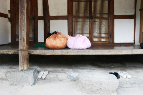 ▲ 진뫼마을 고향집 마루에 올려진 보따리. 언젠가 고향집을 사서 돌아가는 날, 가족들이 일할 때 입으리라고 헌 옷과 양말, 낡은 운동화, 실장갑 등을 보따리에 채곡채곡 쟁여서 간직했던 날 들이 있었다. |