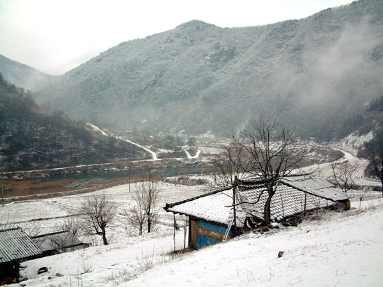 | ▲ 마을 사람들이 나무를 하던 저리소산. 눈 내린 산에 강 안개가 피어 오르고 있다. |