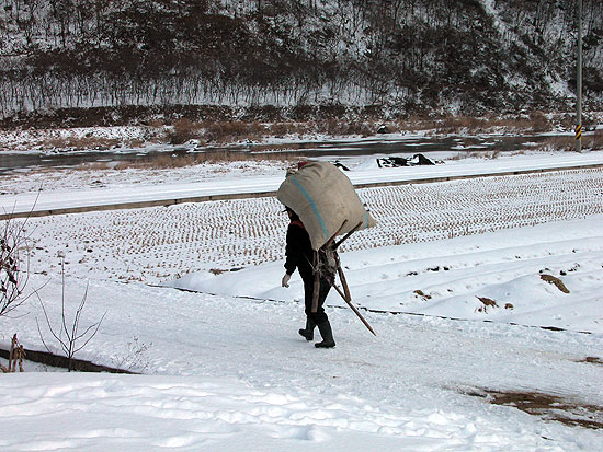 | ▲ 눈 내린 진뫼마을. 지게에 염소 밥 한 짐 지고 가는 아제. |