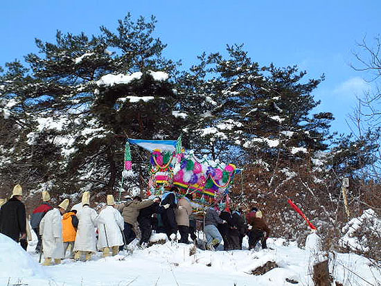 | ▲ “이제가면 언제오나 서러워서 못가겄네….” 이승의 집을 나와 저승의 집으로 떠나는 꽃상여. 애간장 저미는 선소리는 삼쇠 양반, 동팔 양반, 문수 양반의 몫이었다. |