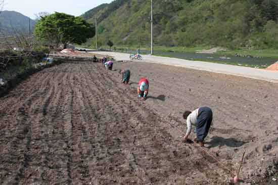 | ▲ 진뫼마을 앞 섬진강변의 밭에서 한데 어울려 산두 심는 어머니들. 2004년 봄. |