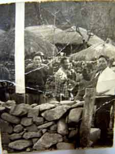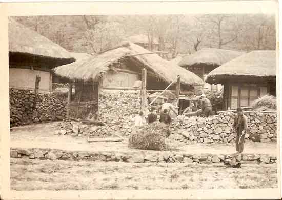| ▲ 오금이네집 돌담 앞, 텃밭에서 울력중인 아버지들. 왼쪽부터 명환이양반, 박샌양반, 동팔이양반(내 아버지). 오금이네 변소 뒤로 우리집이 보인다. |