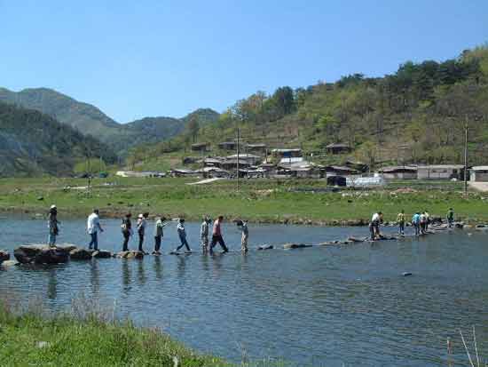 | ▲ 사라진 옛 징검다리를 대신해 지난 2001년 추석 때 고향을 찾은 마을 사람들이 함께 힘을 모아 놓은 새 징검다리. 작업을 하는 동안 예전 징검다리에 얽힌 추억들을 풀어내느라 내내 행복했다. 옛 징검다리가 놓여 있을 때도 여름철 폭우에 징검다리 돌들이 급류에 떠내려가기 일쑤여서 마을 사람들이 울력을 통해 돌들을 다시 이어놓곤 했다. |