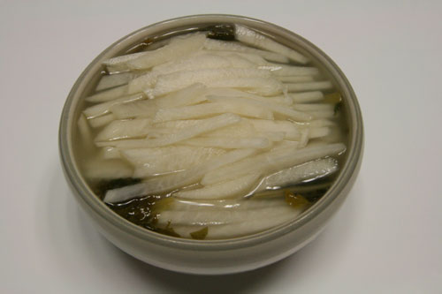 싱건지는 큰 무를 깨끗이 손질해서 소금에 간을 한 다음 항아리 속에 사흘 동안 넣어 두었다가 적당한 양의 물을 붓고 마늘과 생강 풋고추를 넣어 함께 숙성시키면 된다.