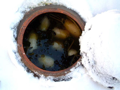 | ▲ 진뫼마을 고향집 마당에 묻어놓은 싱건지. 살얼음 잡힌 싱건지는 겨울 맛 중에서도 으뜸이다. |