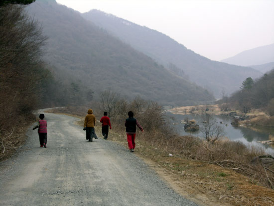 | ▲ 언 강이 풀린 봄날. '몸 만들기'를 위해 섬진강변 흙길을 따라 걸어가는 진뫼마을 어머니들. |