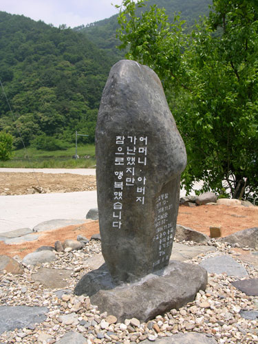 사방을 둘러보아도 산과 하늘만 보이는 땅 진뫼. 두메산골 강변마을에서 일곱 자식 낳아 기르느라 땀과 한숨과 눈물로 살았을 두 분 덕분에 저희 일곱 자식들은 너무 행복했습니다, 어머니 아버지 고생 많으셨다고, 애달프고 고마운 마음 올리려 여기 이 비를 세웁니다.
