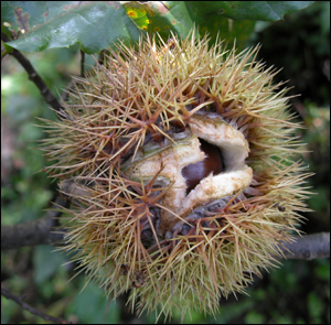 밤송이가 볼긋해지며 벌기 시작하면 아버지와 형님들은 대나무를 들고 익은 밤나무를 골라 땅에 서서 털거나 밤나무에 올라가 털기도 했다. 그러면 어린 동생들은 밤나무 가지 끝에 두 갈래로 벌어진 여린 가지를 잘라 나무집게를 만들어 삼태기에 담거나 밤나무 밭 맨 아래쪽을 향해 던지며 내려왔다. 아버지는 밤나무 밭 맨 아래쪽 중앙에 밤 구덩이를 크게 파 놓았다. 그런데 어찌나 경사가 심하던지 밤 구덩이 가까운 곳에서 밤송이를 털거나 던지면 밤송이가 밤 구덩이 속으로 떼굴떼굴 굴러 쏙 빨려 들어가기도 했다.